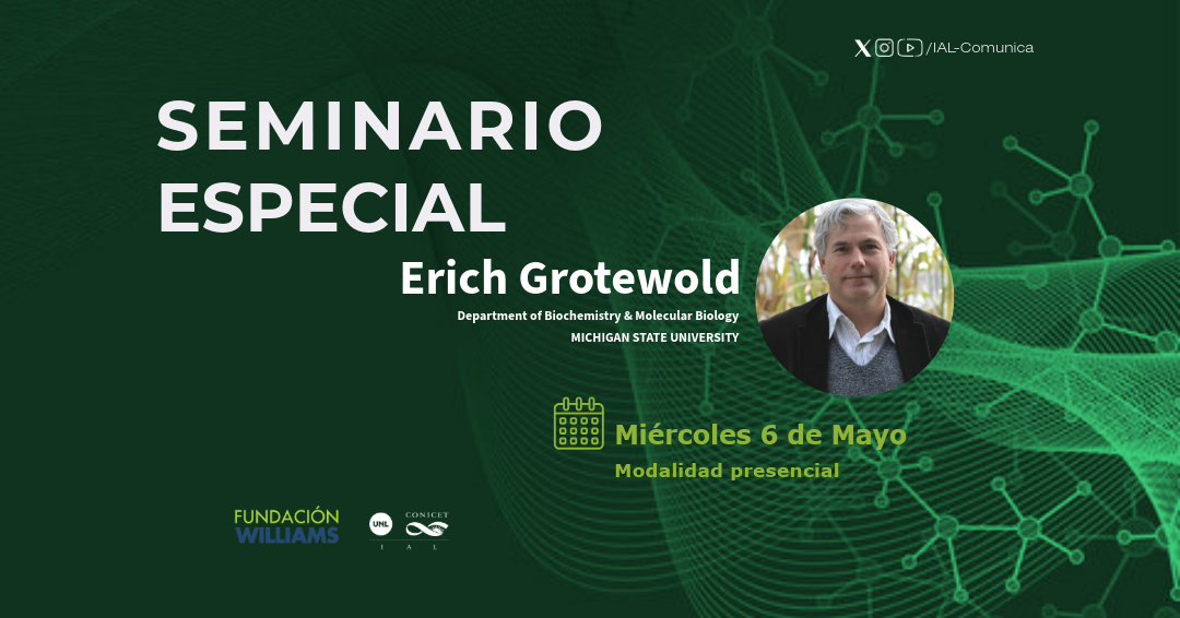 Noticias / Regulatory Activity of Flavonoid Pathway Intermediates Miércoles 6 de mayo a las 12.30 h Regulatory Activity of Flavonoid Pathway Intermediates Seminario Especial Compartir en redes socialesCompartir en FacebookCompartir en Twitter Publicado el 13 de abril de 2026 Tags:seminario especial Seminario Especial a cargo del Prof. Dr. Erich Grotewold (Department of Biochemistry & Molecular Biology, MICHIGAN STATE UNIVERSITY) El seminario se dictará el miércoles 6 de Mayo a partir de las 12.30 h en el Auditorio del IAL inscripciones: seminariosial@santafe-conicet.gov.ar CompartirCompartir en FacebookCompartir en Twitter